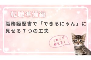 職務経歴書で「できるにゃん」と思われるための7つの工夫を紹介。見た目を整える、職務経験を整理する、成果を数字で示すなど、猫のように楽しくアピールできる書き方のポイントをまとめました。