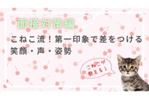 面接で第一印象を最高にする「こねこ流」テクニック!笑顔、声のトーン、姿勢の3つを意識するだけで、面接官に「会いたい」と思われます。「口角を軽く上げるにゃんこスマイル」や「深呼吸で声を安定させる方法」など、今日からできる実践術を解説。